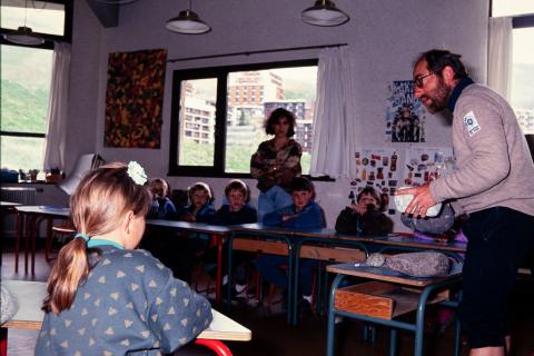 « En Champsaur, terre d’accueil pour les centres de vacances, classes de neige, rousses ou vertes, nous intervenions dans plus de 12 centres. Dès les années 1970, nous sommes mis à contribution pour « semer la bonne nouvelle de la protection de la nature ». À cette époque, le métier d’accompagnateur en moyenne montagne n’était que balbutiant. Comme des missionnaires, nous intervenions surtout l’hiver dans les centres de la vallée. Nous partions avec mon 4L Renault chargé d’un écran, du projecteur photos, de divers montages diapos, d’un tableau récapitulatif sur l’histoire de la protection de la nature et l’organisation du Parc. Et bien sûr de la pelle à neige et parfois des chaînes ! Les animations étaient en fin d’après-midi, avant le souper. La salle de projection était souvent la salle du réfectoire que nous devions partager avec les personnels de service.