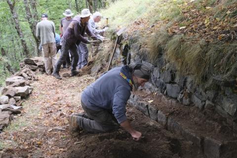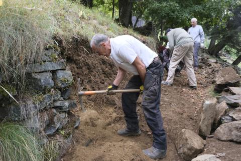 En 2024, les bénévoles ont mené une première opération de deux jours. En ligne de mire, la restauration de la fontaine et de son caniveau, la mise en valeur de la meule de pierre et la reconstruction de certains murets. Les 13 et 14 septembre 2025, deux journées supplémentaires ont permis de continuer la restauration des murets en pierre sèche. Compte tenu de leur état, les murs d’origine ont été abattus et rebâtis de toutes pièces. Dans la joie et la bonne humeur, les volontaires ont déplacé pas moins de 8 tonnes de pierres en un week-end, sous la coordination d’Yves Baret qui a apporté tout son savoir en matière de construction en pierre sèche. Les petits caniveaux présents sous les murs ont également été curés et refaits, ainsi que les revers d’eau nécessaires.