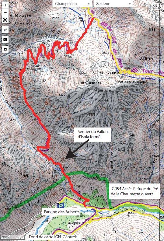 Au départ des Auberts, dans la vallée de Champoléon, l'itinéraire du vallon d'Isola traverse un éboulis fin assez raide. Les intempéries récentes ont mis à mal la plateforme du sentier sur une trentaine de mètres, sur une portion où le sentier surplombe le torrent d'Isola qui coule 50 m plus bas !