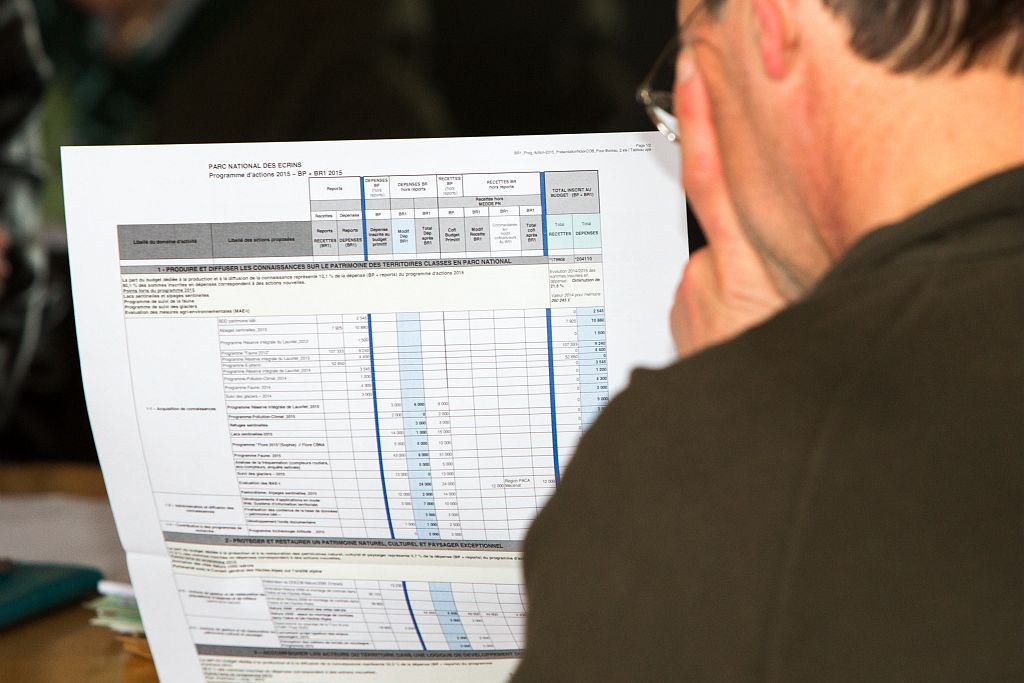 Un bon niveau des reports a été rendu possible par une dotation de l’État supérieure à celle initialement prévue et par une gestion économe du budget 2014. La masse salariale est en légère diminution et les effectifs permanents continuent à diminuer, conformément au schéma de réorganisation adopté en mars 2014 dont la mise en œuvre s’étale sur la période 2014-2016. D’ici la fin 2016, les sept secteurs du Parc national des Écrins seront regroupés en quatre secteurs, dont trois constitués de deux implantations.