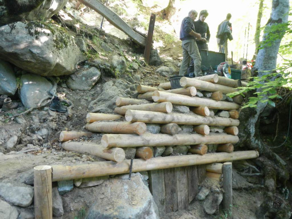 Une trentaine de rondins de mélèzes (des Hautes-Alpes !) a été héliportée et utilisée pour soutenir le sentier d'accès à la Lavine.