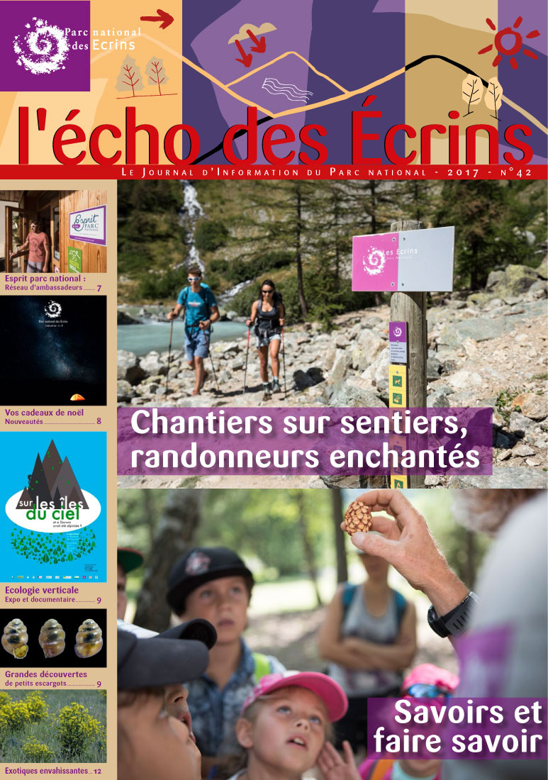 Deux pages de ce numéro sont consacrées aux chantiers menés sur les sentiers en vue d'améliorer, sécuriser et conforter les itinéraires du Grand tour des Ecrins et toutes les offres de randonnées et d'éco-tourisme que le Parc national cherche à valoriser. Les actions de promotion (reportages photo, salons, relations presse, vidéo...) commencent à porter leurs fruits, confortées par des actions autour de la marque collective des parcs nationaux. Avec plus de 200 produits estampillés "Esprit parc national", c'est tout un réseau d'ambassadeurs, inspirés par la nature et le goût du partage qui se met en place.