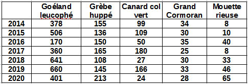 - Le nombre total d'oiseaux observés (743) est en nette diminution par rapport à l’année précédente. Toutefois ces résultats n'ont de sens qu'à une échelle biogéographique continentale, puisqu'il s'agit pour beaucoup d'entre eux d'oiseaux nordiques qui viennent passer l'hiver sur des zones d'eau libre. Leur nombre est donc très dépendant de la température et des conditions climatiques. D’ailleurs, si on considère l’évolution numérique des oiseaux d’eau sur le lac depuis 2014, la tendance observée est liée à deux résultats extrêmes et le résultat n’est pas significatif.