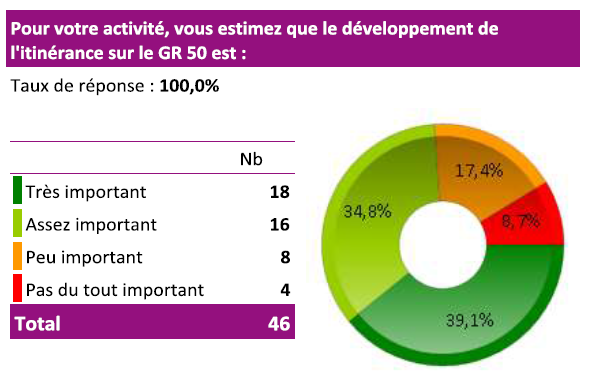 Satisfaits d'être consultés dans ce projet de requalification du GR 50, la plupart des personnes estime que le développement du GR 50 dynamiserait leur économie. Si la randonnée itinérante représente dans l'ensemble une faible part de leur activité (22% en moyenne – 10% maxi pour la moitié), les 3/4 considèrent que l'essor du GR 50 est important pour leur développement.