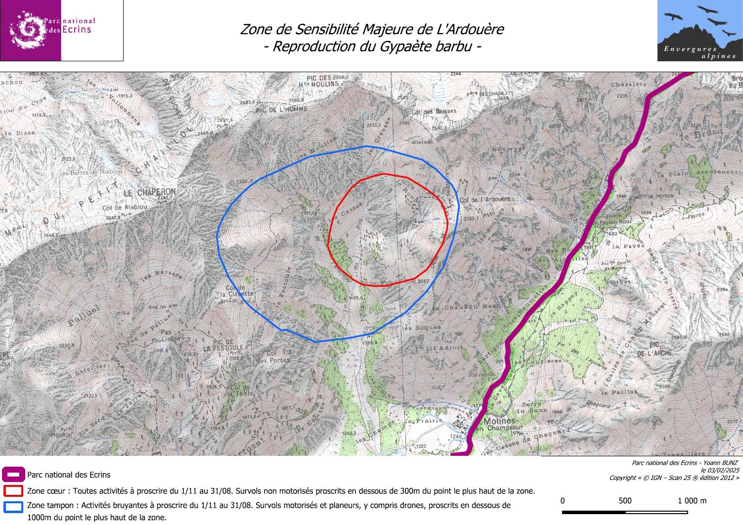 Dans le massif des Écrins, elles sont définies par le Parc national en concertation avec les acteurs du territoire. À ce jour, il en existe cinq : deux en haute Romanche, une dans le Vénéon, une dans le Valgaudemar et une dans la vallée de Molines en Champsaur (voir cartes ci-dessous). Elles sont toutes actives depuis le 1er novembre, théoriquement jusqu’au 31 août. Dans les faits, les ZSM qui ne seront pas le théâtre d’une reproduction effective pourront être désactivées à partir du 1er mars.