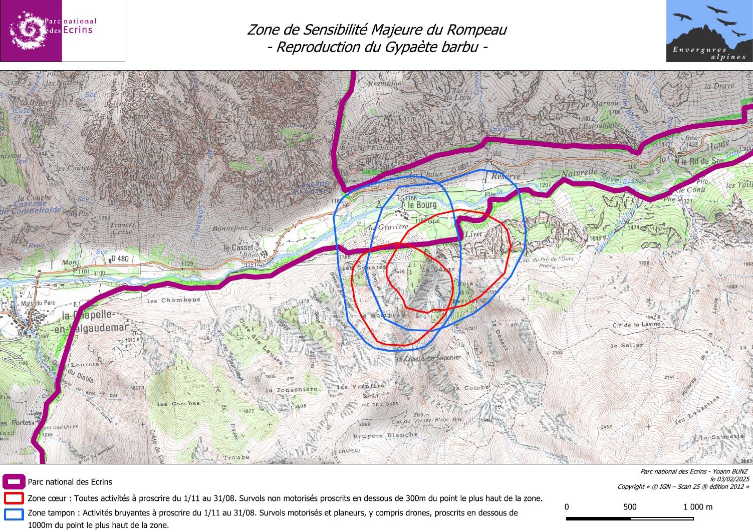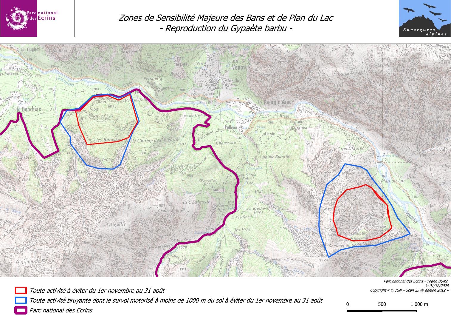 La saison de reproduction du gypaète barbu débute. Dans le massif des Écrins, quatre zones de nidification sont connues à ce jour, auxquelles s’ajoute une aire construite par un couple de mâles. Pour assurer aux rapaces le plus de tranquillité possible, des zones de sensibilité majeure (ZSM) sont en place pour toute la durée de la reproduction.