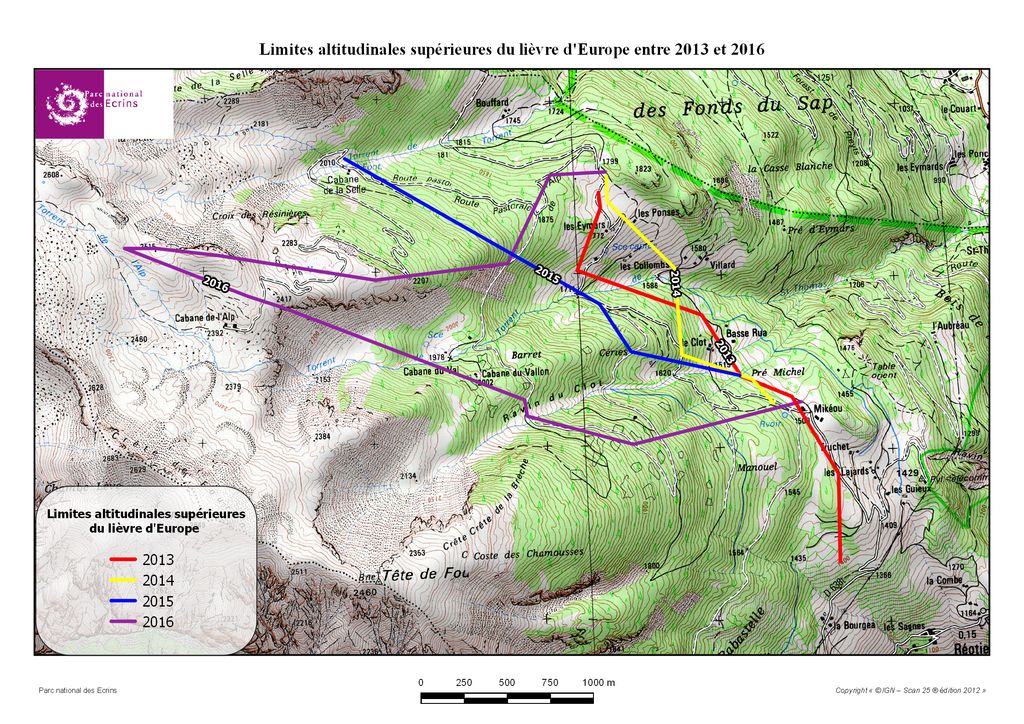 Au final, le danger n'est sans doute pas là. «Le réchauffement climatique favorise d'autres espèces qui, en montagne, peuvent s'installer en plus haute altitude» analyse Michel Bouche, technicien patrimoines au Parc national, qui coordonne le suivi de cette espèce emblématique dans les Écrins. « C'est le cas du lièvre d'Europe que l'on observe de plus en plus haut, y compris en hiver.»