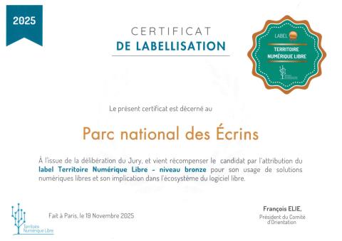 Mairies, Départements, communautés de communes, syndicats mixtes.. : ils ont été dix-neuf à être distingués par le label bronze Territoire Numérique Libre 2025. Ce label récompense les premiers pas des collectivités et des administrations dans le Libre, c’est-à-dire les initiatives ciblées en faveur des logiciels libres, de l’interopérabilité et de la mise à disposition des données publiques. Parmi les heureux lauréats, le Parc national des Écrins a remporté les mentions spéciales de la meilleure première candidature et de la mutualisation, notamment pour la construction, l'animation et la mutualisation des outils Geotrek et GeoNature et de leurs communautés.