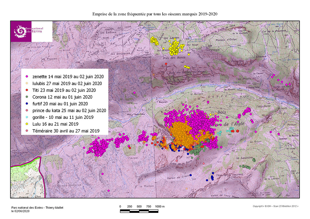 Zone occupée par les oiseaux équipés au 2 juin 2020 - carte tétras lyre Fournel - GPS - Parc national des Ecrins