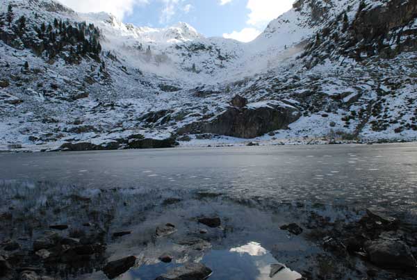 Au fond du Couleau (Embrunais), entre Chateauroux et Saint-Clément quelques centimètres de neige recouvrent le sol dès 1800 m d'altitude. Les éclaircies alternent avec les averses de grésil, le soleil joue avec les nuages...