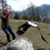 Déposé sur un rocher, il s'envole immédiatement et décrit quelques orbes juste devant l'assistance avant de venir se reposer à une trentaine de mètres du groupe médusé !