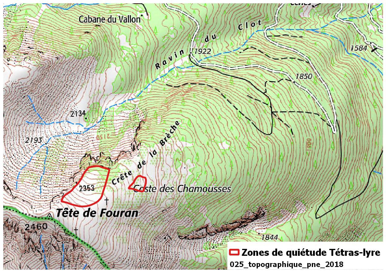 En 2020, l’OFB réalise un diagnostic des habitats d’hivernage selon le protocole de l’Observatoire des galliformes de montagne. En croisant par analyse cartographique les milieux utilisés par les tétras lyres en hiver et la fréquentation par les skieurs, des zones à enjeux sont identifiées. L’objectif est alors de ne pas compromettre la survie des oiseaux tout en maintenant des conditions de ski optimales, tant au niveau qualité que sécurité, pour cette randonnée très appréciée. Un compromis pour partager l’espace est trouvé avec les usagers (guides, club alpin français) : après concertation et visite de terrain, l’OFB et le Parc national des Écrins proposent la création de deux zones de tranquillité. Depuis l’installation des zones en 2021, le PNE effectue le suivi et la maintenance du site.