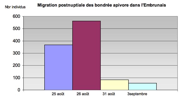 Les deux graphiques suivants indiquent, à titre d'exemple, les variations de passage observées à la fin du mois d'août mais aussi plus particulièrement sur la journée du 26 août 2005 où 561 bondrées ont été contactées de 9h à 14h.