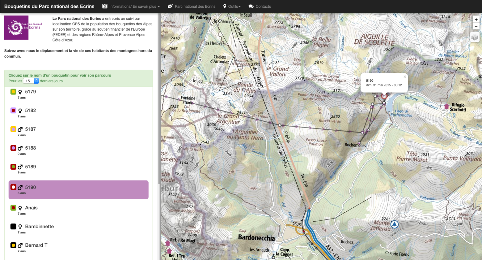 Ce site internet vous permet de visualiser sur votre écran d'ordinateur ou votre smartphone les déplacements des bouquetins équipés d'un collier-émetteur dans les Écrins. Un outil de partage des données scientifiques, utile notamment pour les écoliers du territoire qui suivent cette opération.