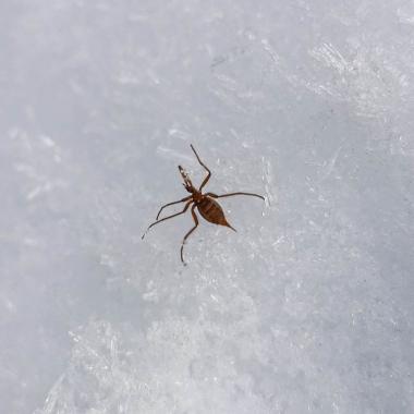 Nous approchons de la pente de l'Aiguillette du Lauzet. Alors que nous discutons de la probabilité de retrouver le bouquetin mort et déjà bien dévoré par les prédateurs qui sont toujours dans l'attente d'une telle aubaine, nous repérons un renard sur l'avalanche qui s'enfuit à notre vue. Jean nous conduit à l'endroit où était le bouquetin mais le vent a, là -aussi, tout modifié depuis hier.