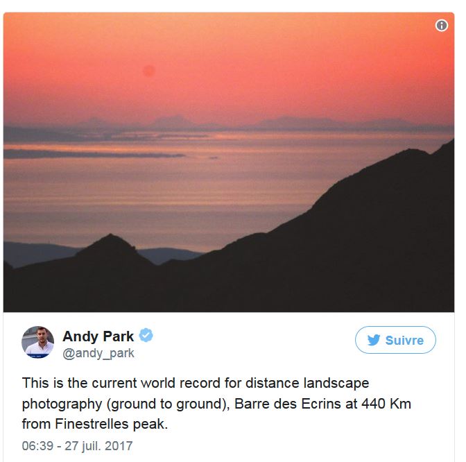 Fin juillet, le Dauphiné Libéré a publié une photo, prise depuis les Pyrénées, qui laisse apparaître au lointain le sommet de la Barre des Écrins, en arrière-plan de la Méditerranée... On ne s'engagera pas sur le "record" mais la performance de la prise de vue est impressionnante.