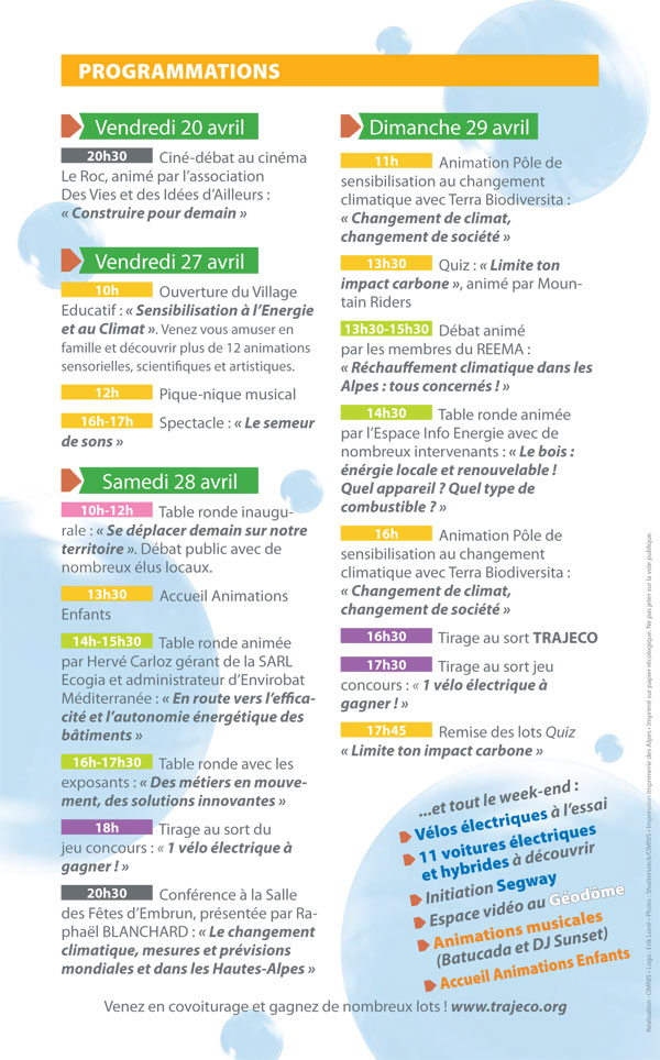 2012-04-festival-energie-affLe Festival des Montagnes d'Energie se déroulera les 27, 28 et 29 avril 2012 au plan d'eau à Embrun. Tout un programme autour des énergies renouvelables, des économies d'énergie, des transports, du changement climatique...