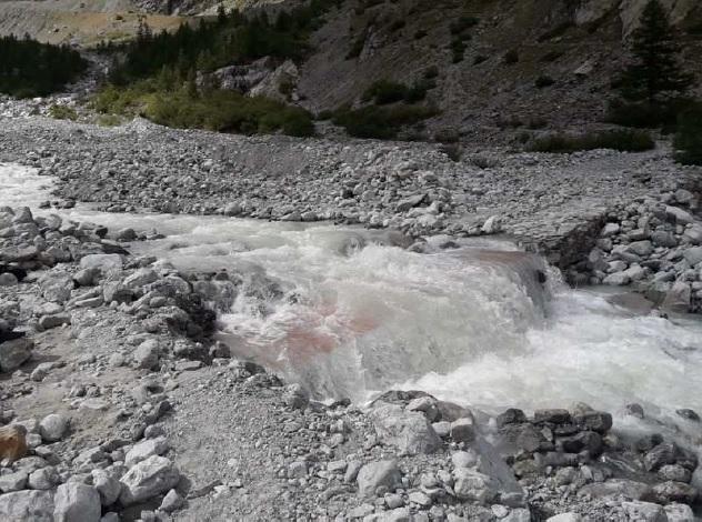 La passerelle du glacier Noir submergée lors de la crue d'août 2020