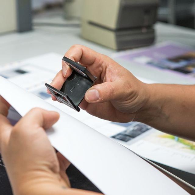 Pour aller plus vite, on imprime même plusieurs feuilles du calendrier en même temps. Il faut donc régler de manière indépendante l'intensité de chaque couleur sur les rouleaux. On sera plus rouge à gauche, moins vert à droite et noir au centre. Le conducteur de la machine peut influer d'une manière très fine sur cet encrage.