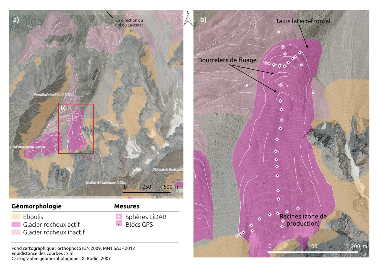 Le contexte géomorphologique dans la combe de Laurichard, montrant notamment l'emprise dans le paysage des glaciers rocheux et des éboulis. b) Les dispositifs permettant le suivi du glacier rocheux de Laurichard (sphères pour les mesures par LiDAR terrestre, et blocs marqués pour les mesures annuelles par GPS).