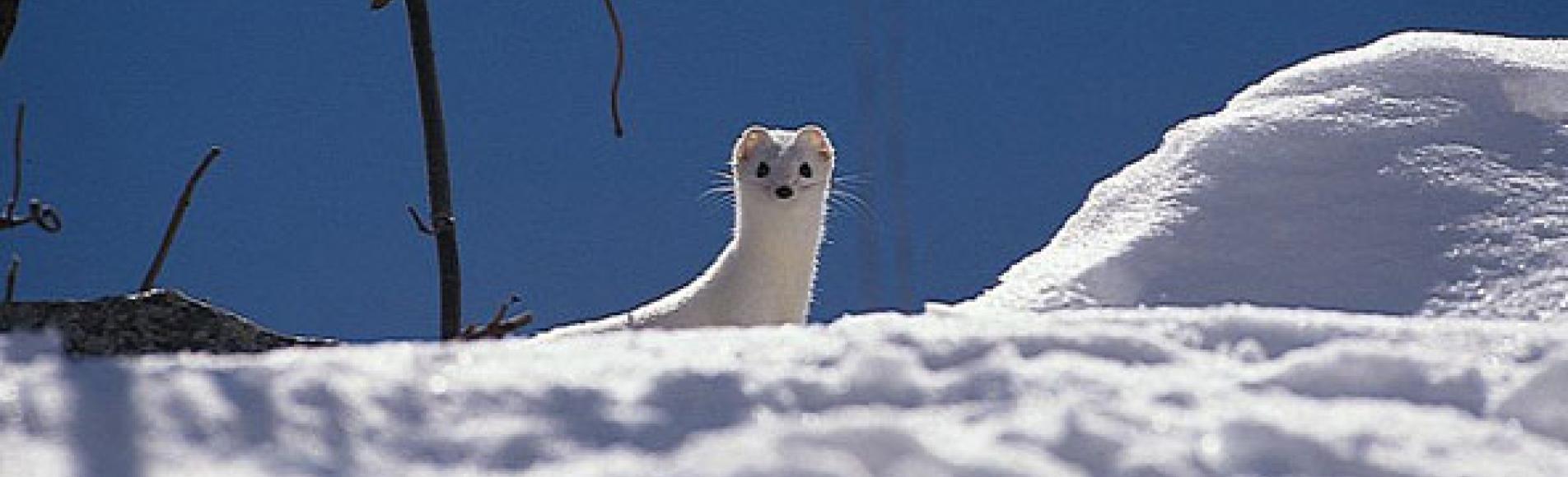 En été, leur pelage à toutes deux est fauve dessus - blanc dessous, mais les choses sont bien différentes en hiver... L'hermine change de livrée et devient toute blanche, à l'exception d'un plumeau noir au bout de sa queue, assorti aux 3 boutons noirs formés de ses yeux et de sa truffe. C'est par ce critère qu'elle est facile à différencier de la belette. A noter pourtant, que la belette devient blanche en hiver, uniquement dans le nord de l'Europe. D'où son nom latin Mustela nivalis (neige en latin).