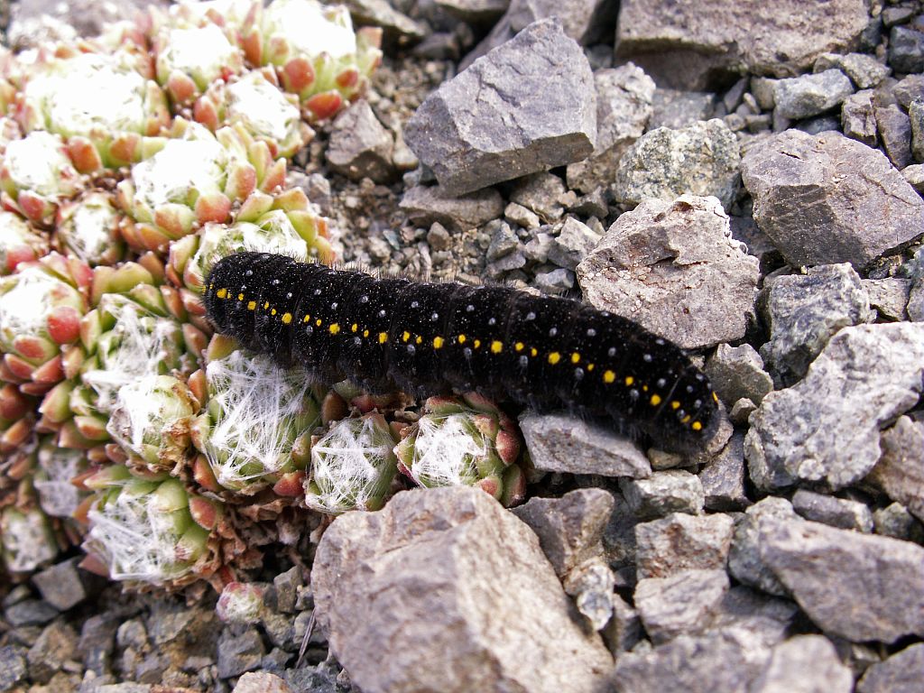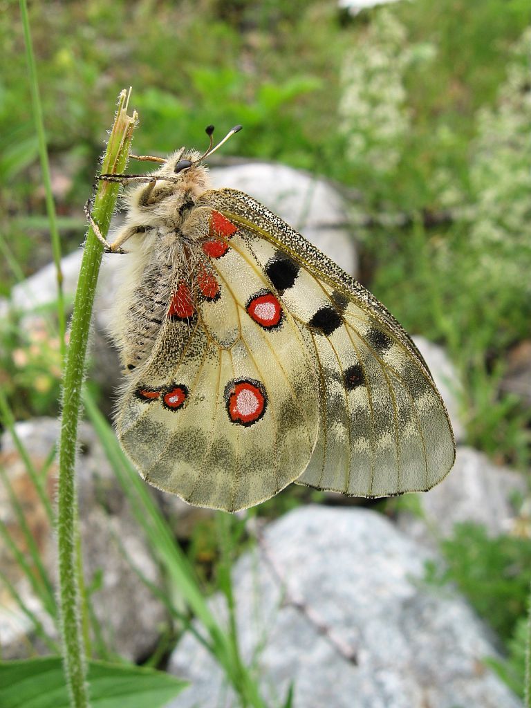 L’apollon est beau comme un dieu : une robe d’une blancheur translucide parsemée de taches noires, des ocelles d’un rouge lumineux, des ailes hyalines aux bordures dépourvues d’écailles. Il a besoin de la chaleur du soleil pour voler. Qu’un nuage passe et il se pose sur un chardon ou quelque centaurée dont il appréciera le nectar. Dans les éboulis ensoleillés des vallées du Parc national des Ecrins, orpin ou joubarbe serviront de plante nourricière à sa belle chenille d’un noir velouté pointillé d’orange. Fermeture des milieux et hivers anormalement chauds ont entraîné sa disparition des Causses cévenols. Les éboulis rebelles au boisement semblent une solution de repli. Prendre de l’altitude pour survivre, une tendance bioclimatique à suivre…