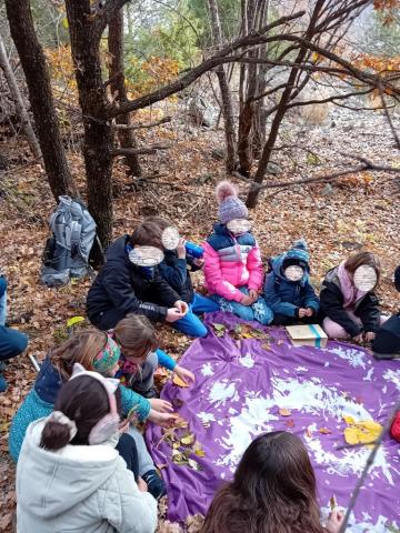 Par la suite, Stéphanie nous a lancé un défi. Nous avons été répartis en équipes afin de collecter le maximum de feuilles d’arbres différentes. Notre balade nous a conduit jusqu’à un petit bosquet dans lequel nous nous sommes arrêtés. Stéphanie a étendu une grande « nappe » avec le logo des Parcs nationaux et de la couleur du Parc des Écrins : le violet.