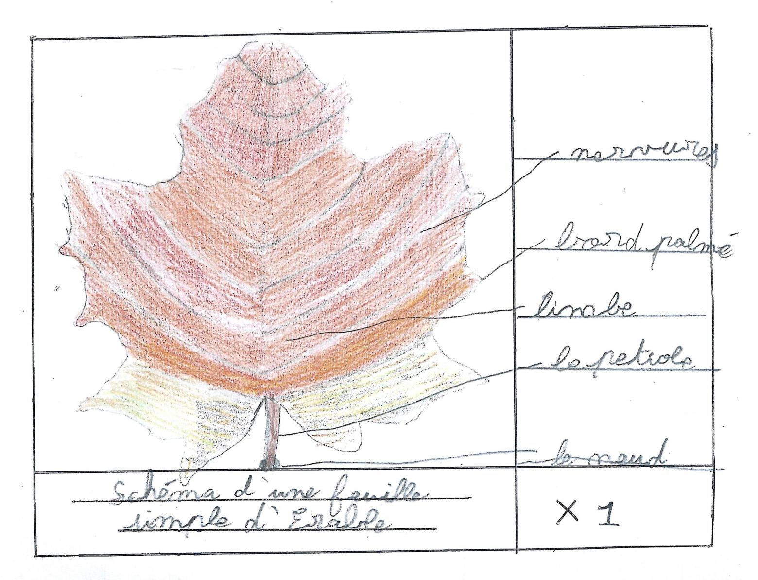 Schéma d’observation d’une feuille simple réalisé en classe grâce au lexique scientifique donné par Stéphanie