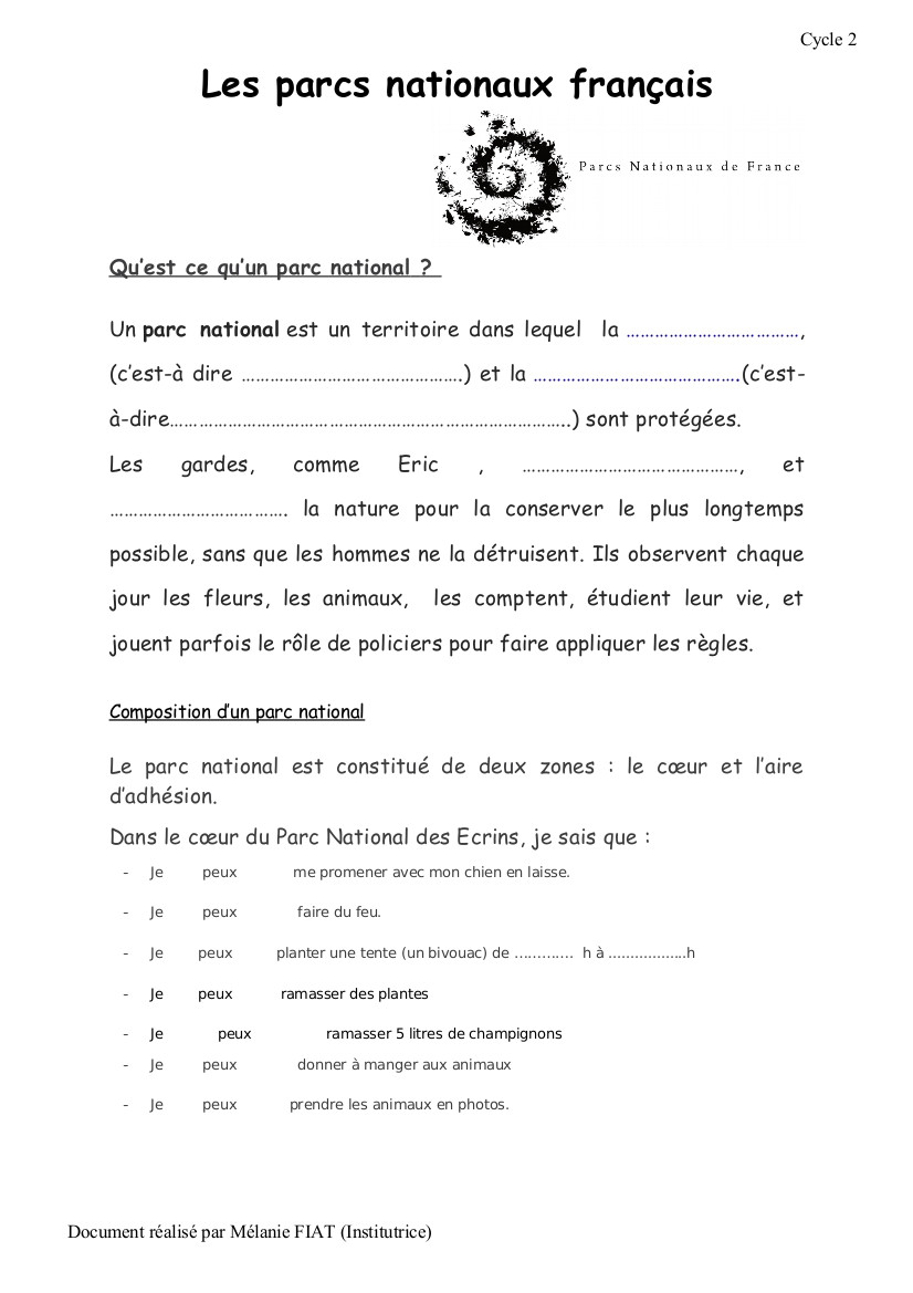 Grâce à un diaporama et à une fiche activité, nous avons appris qu'un parc national est composé d'une aire d'adhésion (zone du parc où nous habitons et où se trouve notre école) et d'un cœur dans lequel s'applique une réglementation particulière pour protéger la nature.