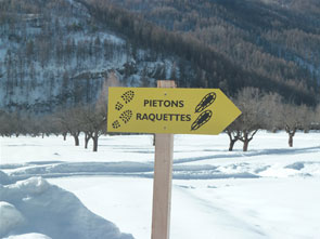 Non loin de l'école, un panneau nous indique le chemin pour les piétons et les gens en raquettes. Dessus, sont dessinées des empreintes de pas (chaussures) et de raquettes.