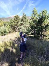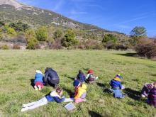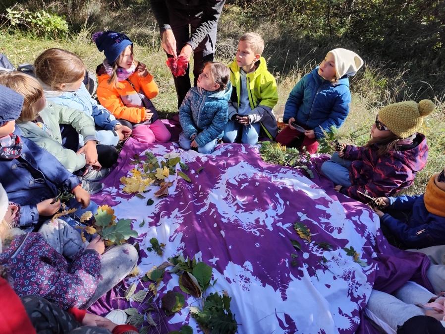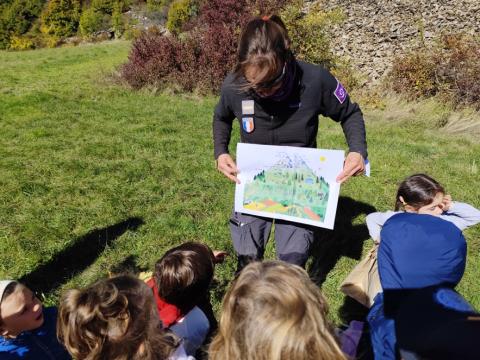 Mardi 7 octobre, la classe des maternelles-CP de l’école La Fraxinelle a retrouvé Stéphanie Limon du Parc national des Écrins pour une sortie à proximité de l’école. Nous avons commencé par observer le paysage autour de nous et nous avons identifié les principaux étages : l’étage alpin, subalpin, montagnard et collinéen.